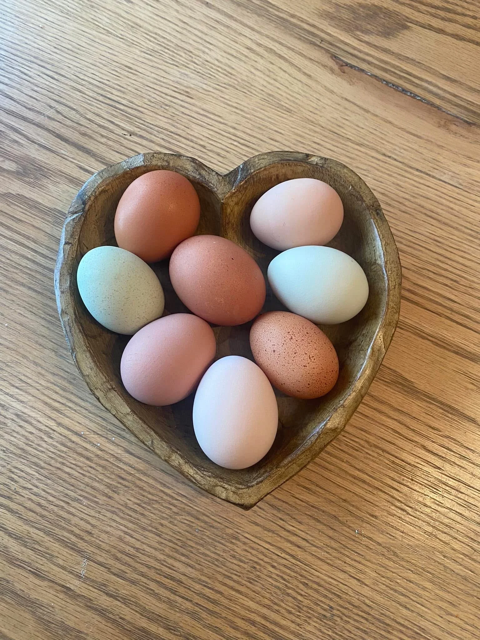 Our eggs come from our happy & health flock of hens. We feed them an organic diet and they free range around our property during the day. They have all been tested for common illnesses by the state prior to use selling their eggs. Our variety of breeds provides us with a wonderful array of egg colors!